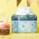 Un beau papier d'emballage cadeau, parfait pour les anniversaires, les diplômes et les cadeaux pour célébrer n'importe quelle occasion, avec un magnifique jardin de fleurs de Lily de la Vallée avec des papillons, le tout dans les tons de vert et bleu.
