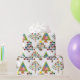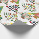 Ce papier d'emballage a un design moderne du milieu du siècle des arbres de Noël dans différents styles. L'une a une grille avec des rectangles avec des éclats à l'intérieur. Un autre comporte des rectangles arrondis avec des rectangles plus petits à l'intérieur. Un troisième a des lignes courbes avec des étoiles sur elles. L'arbre final est un triangle avec d'autres petits triangles à l'intérieur.