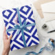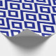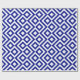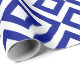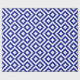 Ce motif géométrique aux tons bleus et blancs est un design original. Les méandres blancs tournent autour de diamants bleus foncés contenant des diamants blancs. Des zigzags bleus vibrants séparent subtilement les chemins sinueux.