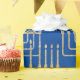 Un papier cadeau Hanoukka moderne argent, or et bleu avec un magnifique menorah carré argent et or brillant avec des bougies éclairées dans un motif géométrique.