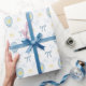 Papier d'emballage cadeau de baby shower, jouant et neutre pour le genre, avec des illustrations dessinées à la main, comme un mignon canard en caoutchouc dans un cadre bleu ruban tendre attaché dans un arc et des bulles dans un jeu de couleurs bleu et jaune doux.