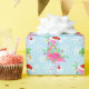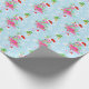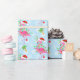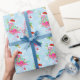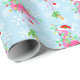 Flamands roses de Noël aux lampes à cordes et chapeau de Père Noël sur un arrière - plan bleu pastel aux flocons de neige et aux palmiers à la décoration festive. Montré ici sur papier d'emballage cadeau personnalisable. Vous pouvez facilement redimensionner le motif à votre préférence et sélectionner votre couleur arrière - plan préférée. C'est un mignon motif pour fêter Noël à l'ambiance tropicale !