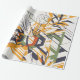 Bold modern floral pattern wrapping paper featuring minimalist tulip line art layered with striking geometric blocks in orange, green, and navy blue on a clean white background. A high-contrast, graphic design with a fresh contemporary vibe.