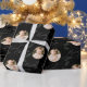 Christmas gift wrapping paper feature modern Merriest Christmas script and pine tips, with personalized family name and two photos in sage green, black and white. simple and elegant.