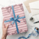 Papier d'emballage moderne et girly avec or rose personnalisable joyeux anniversaire sur un beau rose, mauve, rose rayures d'or arrière - plan.