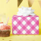 Ce papier d'emballage présente un motif de plaid en vichy rose et blanc chaud.