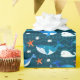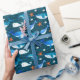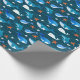 Adorable trois types d'illustrations de baleines sur un arrière - plan motif hawaïen turquoise sombre et tribal. Minuscule, orange, étoiles de mer en motif.