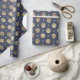 Papier d'emballage motif nautique bleu et or avec coquillages et perles dans un motif en treillis.