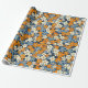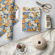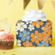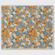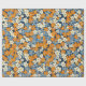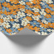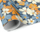 Un motif floral vibrant couvre l'ensemble de l'image. De petites fleurs stylisées dans les tons orange, bleu clair et blanc cassé sont densément disposées sur un arrière - plan bleu marine. Les fleurs ont un aspect légèrement imparfait, peint, avec des variations dans la saturation des couleurs et la forme qui donnent au motif un look texturé, presque peint à la main. Le motif répété crée un effet visuel gai et occupé.