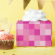 Ce papier d'emballage comporte des carrés dans différentes nuances de rose dans un motif pixelated.