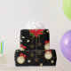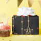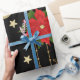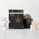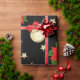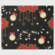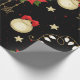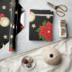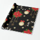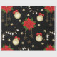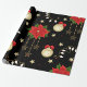 Un rouleau de papier d'emballage avec un arrière - plan noir, décoré d'un motif répétitif d'éléments à thème Noël. La motif comprend des poinsettias rouges avec des feuilles verts, des ornements de Noël dorés ornés d'arcs rouges et de motifs de flocs de neige, des cordes de lumières avec des ampoules blanches, et des étoiles dorées de différentes tailles. De petits points rouges en forme d'étoile sont disséminés dans tout l'arrière - plan, ajoutant à l'aspect festif. Le papier d'emballage est partiellement déroulé, ce qui révèle le motif et le bord roulé.