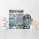 Trois duckies en caoutchouc de petit jouet mignon utilisent les casquettes et la palette de Père Noël autour d'un papier d'emballage d'hiver d'étang de vacances neigeuses froides de Noël