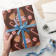 Notre savoureux papier d'enveloppement de pain d'épice de Noël Cookie Cupcake présente des illustrations aquarelles de gâteau au chocolat avec glaçage rayé rouge et blanc surmonté d'un arbre de Noël Gingerpain et de bonbons de menthe rouge et blanche sur un arrière - plan brun chocolat foncé.