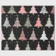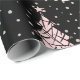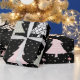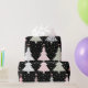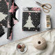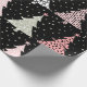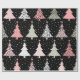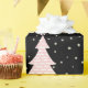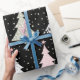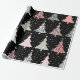 Une flamme moderne distincte dans le papier d'emballage de Noël, avec une impression recouverte d'arbres de Noël répétitifs, tout en rose, gris et noir.
