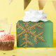 Ce papier d'emballage de Noël présente un design vert et or, avec un motif de décorations de Noël en or métallique frappant sur un arrière - plan dégradé vert. Il y a de grands flocons d'or, des feuilles sacrés dorés, un petit Père Noël d'or et son traîneau tiré par des rennes, et un accueil très festif de "Joyeux Noël".