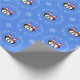 Le texte sur ce papier d'emballage mignon est en blanc et peut être édité pour votre salutation préférée : "MERCI NOËL BONNE ANNÉE". Le design montre une famille de pingouins portant des foulards rayés et des casquettes festifs. L'arrière - plan est bleu poudré, et il y a aussi des flocons blancs décoratifs.