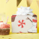 Notre enveloppement cadeau de Noël Snowman à la crème de chocolat Cupcake présente des illustrations aquarelles de cupcake au chocolat avec glaçage blanc et un joyeux marshmallow Snowman sur le dessus entouré de bonbons rayés de menthe rouge et blanche sur un arrière - plan beige neutre.