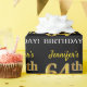 Ce design papier d’emballage comporte un message comme "64e anniversaire de Jennifer!", le "64e" ayant une apparence de couleur fausse/imitation or. Le nom peut être personnalisé, et l'arrière - plan est de couleur noire. Il pourrait peut-être être utilisé pour envelopper les cadeaux donnés pour le soixante-quatrième anniversaire de quelqu’un. [~Z0000177]