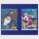 Peinture acrylique colorée, brillante, capricieuse et artistique, Père Noël joue du violon au clair de lune, un hibou, ornements floraux, plantes d'hiver, rubans rouges, jouets pour enfants, baies saintes en rouge vif, vert, blanc, bleu, jaune. par Bulgan Lumini (c)