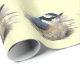 Ce papier d'emballage est décoré d'un motif répétitif du Nuthatch à la poitrine rouge qui semble prendre la tête ! C'est un très petit oiseau avec une poitrine de couleur rouille, un dos bleu et gris et une bande d'oeil noir sur son visage blanc. Sa tête et son bec sont très grands proportionnellement à son corps.