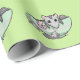 Quatre gris et opossums roses dans et autour d'une tasse de thé verte et rose. Les plus grands sembler d'opossum amusés tandis que les opossums plus petits jouent et grimpent autour de la tasse de thé.