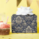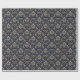 This elegant wrapping paper features a luxurious navy blue background adorned with intricate gold and cream floral motifs, creating a sophisticated baroque style. The symmetrical layout showcases large stylized flowers surrounded by smaller buds and leaves, offering a richly decorated appearance that exudes timeless elegance. Perfect for special occasions, this design captures an opulent mood, making it ideal for gifting and celebrations where a touch of classic luxury is desired.