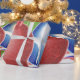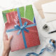 Cette image représente des boules de Noël en rouge, bleu et vert. Rubans et étoiles en blanc, bleu et rouge sont visibles partout. Un dossier vert a été ajouté. Une parties scintillant a été ajoutée à cette conception. Une bordure rouge a été ajoutée. Ce papier d'emballage de Noël est disponible en différents styles et tailles.