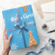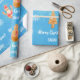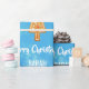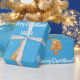 Enveloppe cadeau de Noël moderne pour les enfants, avec un design élégant qui comprend un bonhomme de neige en pain d'épice, un arbre de Noël et Père Noël, des flocons de neige, le salut "Joyeux Noël" dans la typographie stylisée, et un nom personnalisé. Sur un arrière - plan bleu avec des flocons de neige.