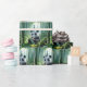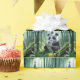 Un panda habillé d'un casquette de fête coloré lit une carte d'anniversaire assis dans une forêt luxuriante de bambous
