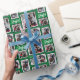 Utilisez 5 de vos meilleures photos de famille pour faire votre propre papier d'emballage personnalisé. Cette enveloppe cadeau verte, blanche et noire a quelques simples flocons de neige et le mot joyful ajouté pour compléter le design.