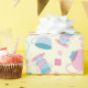 Un mélange de théières et de personne et de piles bleues et roses de tasses de thé parmi le rose de rose se développe et les papillons roses au-dessus d'un arrière - plan jaune pâle.