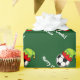 Papier d'emballage pour ballon elfe de Noël pour enfants. Jolie conception de vacances hiver pour joueur de football, entraîneur et fans. Rouls cadeau Funny Xmas pour hommes, femmes et enfants (garçons et filles). Personnalisable avec nom personnalisé et saisons saluant comme Joyeux Noël. Couleurs vertes et rouges. La couleur Arrière - plan est personnalisable. Ballon de football sportif avec casquette mignon. La typographie Whimsical. Disponible en mat et brillant. Fournitures d'emballage cadeau personnalisées.