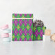 Un motif arlequin de vert et de violet se transforme en Jacquard ludique avec une superposition de silhouettes de diamants dorés et de fleur de lis, créant un motif amusant et coloré parfait pour toute célébration Mardi Gras influencée par la Nouvelle-Orléans.