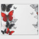 Un troupeau de papillons de morpho volants, réalistes, rouges et noirs sur un arrière - plan blanc avec des gouttes de peinture.