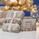 romantic Paris winter Christmas street scene illustrated in a soft painterly storybook style, elegant Haussmann buildings decorated with red garlands, wreaths, and ribbons, gently falling snow, evergreen Christmas trees with red ornaments and bows, warm glowing shopfronts with striped awnings, subtle repeating Eiffel Tower silhouettes partially obscured by snowfall, bare winter trees dusted with snow, cozy nostalgic European holiday atmosphere.