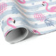 Envelopper le papier avec un motif avec une ambiance estivale amusante. Flamants roses et ananas posés sur un motif rayé bleu clair avec feuilles et coeurs tout autour.