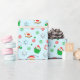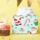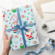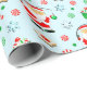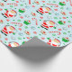 Emballage cadeau de Noël à thème de pêche ou décor de fête de vacances avec un pêcheur de Père Noël tenant une canne de pêche entourée de friandises de Noël.