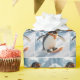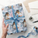 A penguin wearing goggles and an orange scarf is snowboarding down a snowy slope