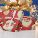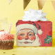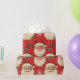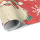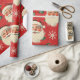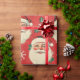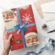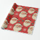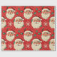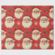 Ce papier d'emballage de style vintage présente un motif répétitif de visages classiques du Père Noël. Chaque Père Noël possède un casquette rouge et une barbe blanche, avec des joues roses et une expression joyeuse. Les Santas sont parsemés de pins verts, apportant une touche de verdure festive à l'ensemble. L'arrière - plan a un aspect rouge, texturé, légèrement vieilli, lui donnant une sensation nostalgique.