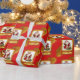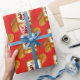 Beau papier d'emballage de Noël en couleur rouge et franges dorées avec le Père Noël en cadre doré souhaitant "Joyeux Noël".Vous pouvez personnaliser le texte aussi bien que vous préférez.