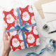 Des illustrations de style vintage d'un visage de Père Noël portant un chapeau de Père Noël rose sont dressées contre un arrière - plan rouge à motifs sur ce papier d'emballage à l'allure rétro.