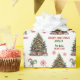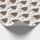Le motif répété sur ce papier d'emballage de Noël comprend l'image d'un adorable petit chien de chiot portant un chapeau et une écharpe de Père Noël rouge et vert. Il est assis en face d'un arbre de Noël décoré avec des paquets cadeaux en dessous. Le texte rouge et vert dit MERRY CHRISTMAS", avec le nom de votre enfant et votre signature ci-dessous. Parmi les autres images incluses dans la motif, on trouve des flocons de neige décoratifs rouges et des sucres de canne attachés avec un arc.