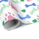 Are you looking for a way to make a gift for a dog lover special? This wrapping paper features a pattern of pink dog paws, blue dog bones, green hearts and woof text.