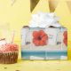 Une fleur d'hibiscus rouge vif se trouve délicatement sur la plage de sable à côté d'une élégante faire-part de mariage blanche en relief