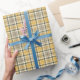 Papier d'emballage avec un motif original de plaid de Plaidwerx en jaune de beurre, noir, taupe et ivoire.