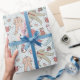Ce joli papier d'emballage personnalisé pour Baby's First Christmas comporte un motif de costumes de bébé dessiné à la main, d'adorables animaux en peluche d'hiver (pingouin, rennes, ours en peluche), des bibs, des bouteilles, des suces et des cadeaux de Noël, le tout contre un doux arrière - plan bleu bébé avec des petites étoiles parsemées. Personnalisez avec le nom du bébé pour faire ce papier d'emballage uniquement le vôtre!