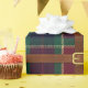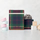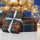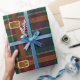 This design features a classic tartan or plaid pattern in rich, traditional colors like deep navy blue, dark green, and maroon red with hints of yellow or cream, creating a festive and cozy aesthetic. Overlaid on the plaid is a repeating, grid-like pattern of brown leather straps with gold buckles, evoking the look of luggage, equestrian gear, or a secured trunk. The combination of the warm plaid and the strapped detail makes this a sophisticated and robust design, perfectly suitable for Christmas wrapping paper that suggests a feeling of tradition, quality, and rustic holiday charm.
