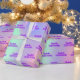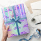 Elégant, girly, style glamour papier d'emballage cadeau de fête pour une Quinceañera, 15e anniversaire. Un arrière - plan tendance irisé avec des couleurs unicorne et arc-en-ciel en rose, violet, or rose, vert menthe. Décoré avec des gouttes de parties scintillant en or rose, rose, violet. Personnalisez et ajoutez un nom et un texte. Lettres violettes.