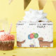 Design à thème d'anniversaire mignon avec l'illustration originale de Destei d'une jolie robe rouge couleur Golden Retriever race dog. Le chien a une expression de visage heureux avec des yeux gentils et la langue rose du chien montre. A côté du chien il y a des ballons colorés d'anniversaire attachés sur un os de chien et une boîte cadeau de couleur violet et jaune. L'arrière - plan a un motif ludique de confettis pastel colorés sur un arrière - plan blanc. Vous trouverez également une zone de texte personnalisable.