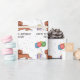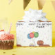 Design à thème d'anniversaire mignon avec l'illustration originale de Destei d'une robe rouge cheveux longs chien de race Dachshund. A côté du chien il y a des ballons colorés d'anniversaire attachés sur un os de chien et une boîte cadeau de couleur violet et jaune. L'arrière - plan a un motif ludique de confettis pastel colorés sur un arrière - plan blanc. Vous trouverez également une zone de texte personnalisable.